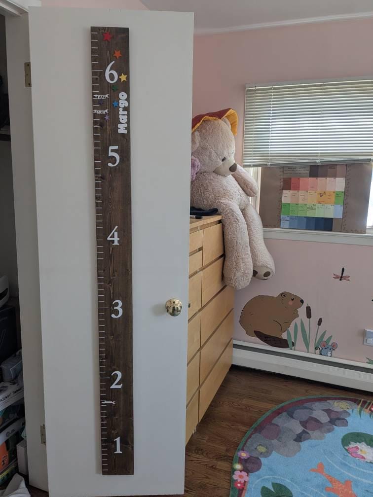 • Growth charts measure 6ft x 5.5 inches x 1 inch. They are sanded and stained by hand. All boards are sealed for protection and durability.