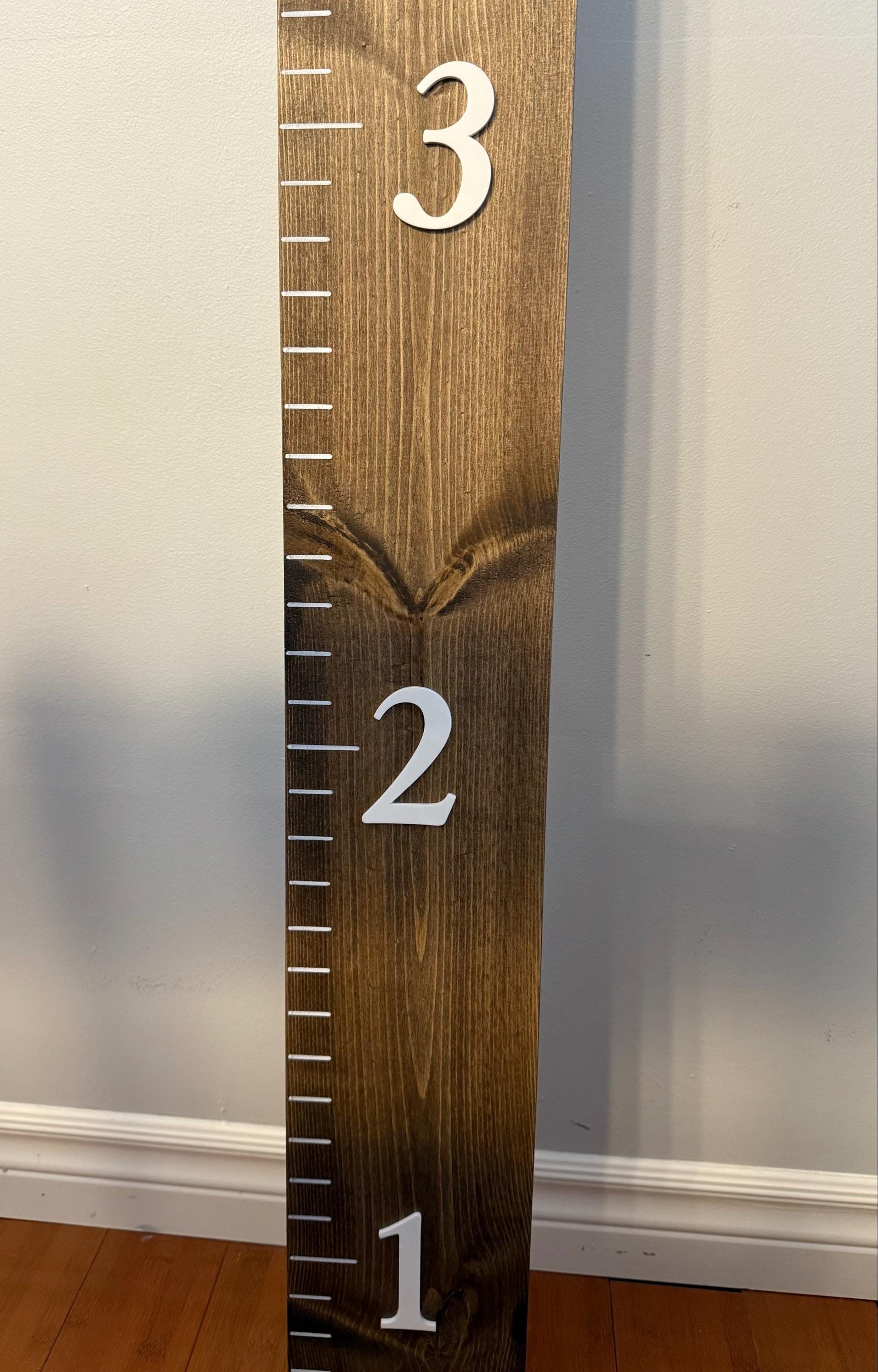 • Growth charts measure 6ft x 5.5 inches x 1 inch. They are sanded and stained by hand. All boards are sealed for protection and durability.