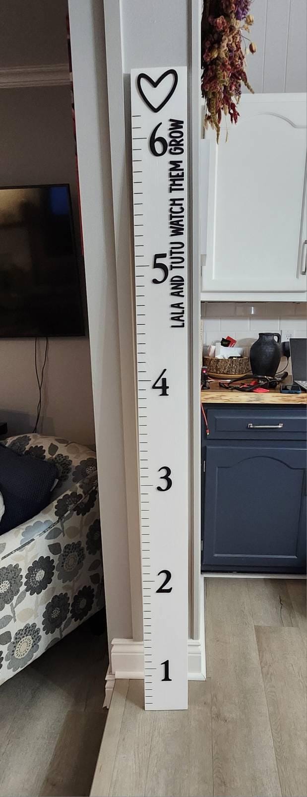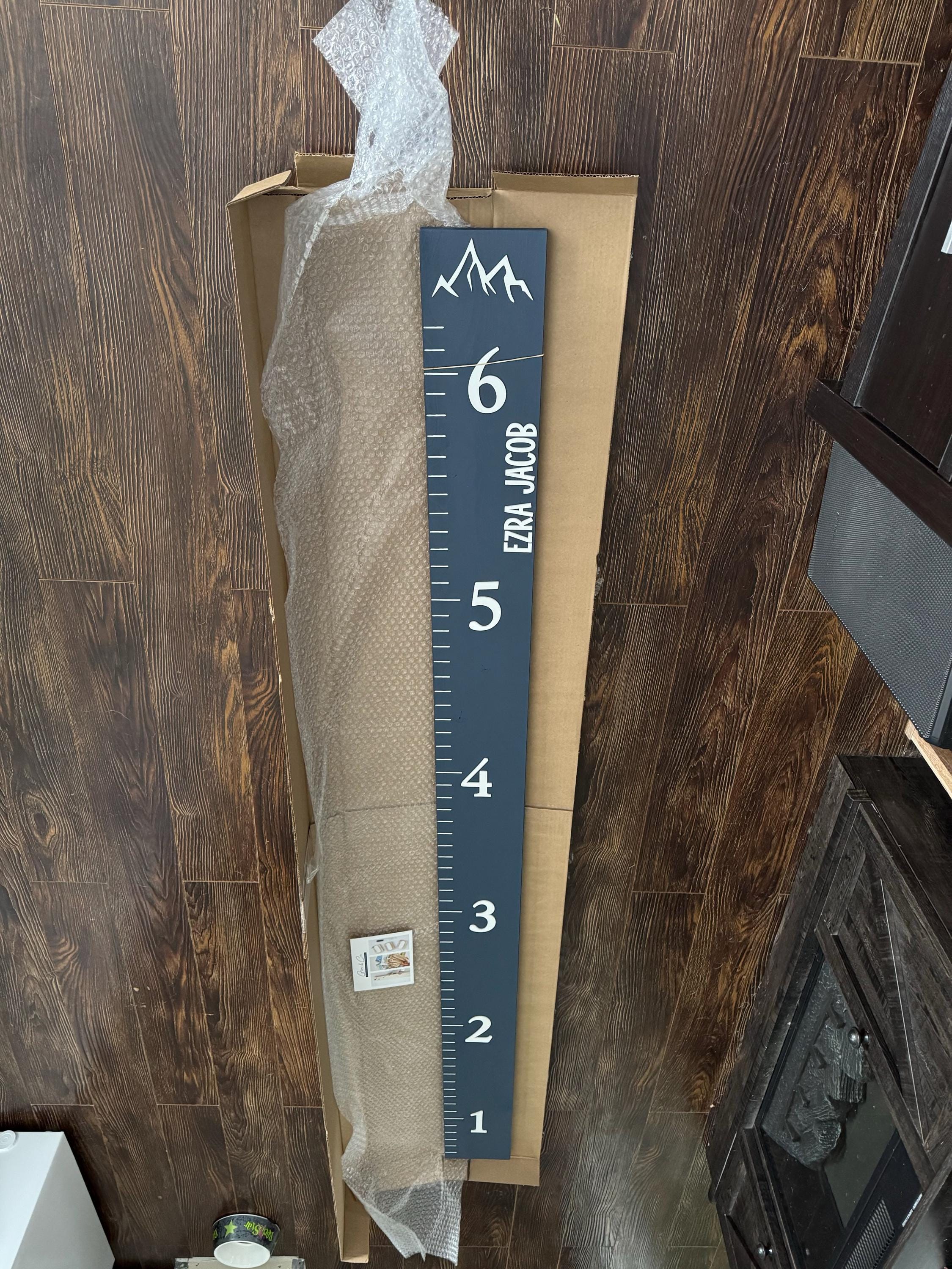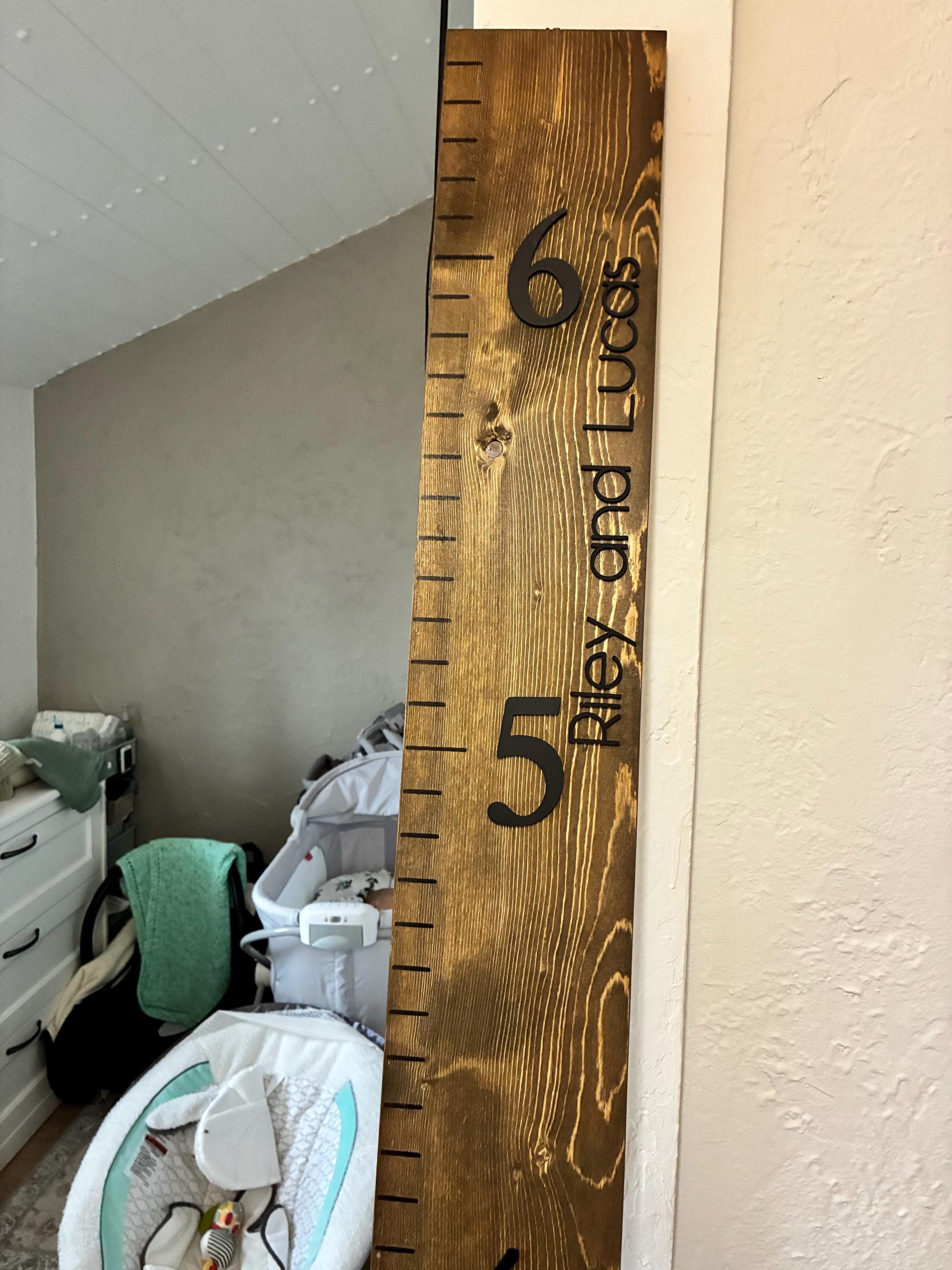 • Growth charts measure 6ft x 5.5 inches x 1 inch. They are sanded and stained by hand. All boards are sealed for protection and durability.