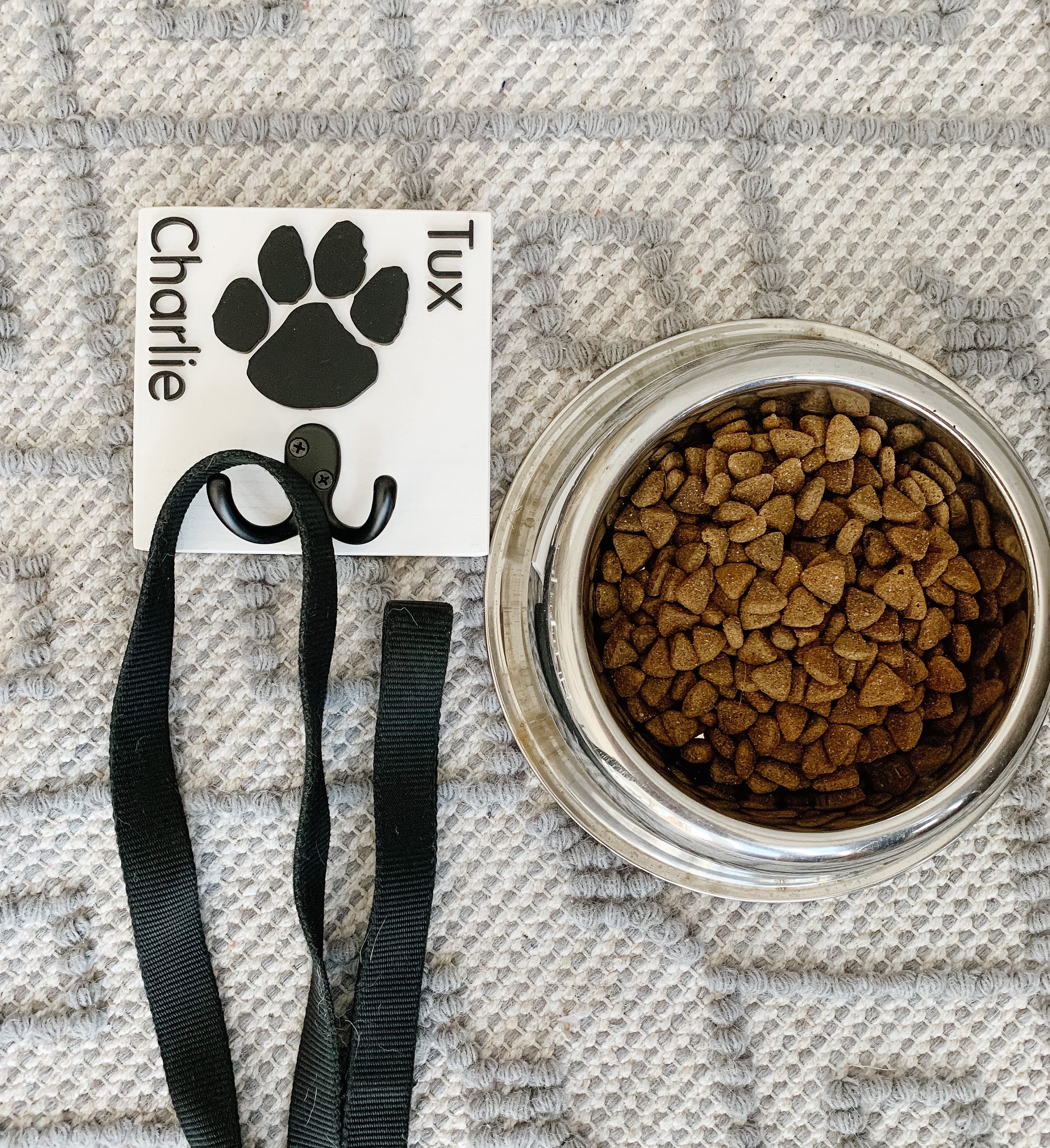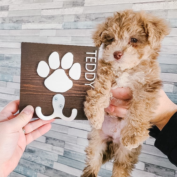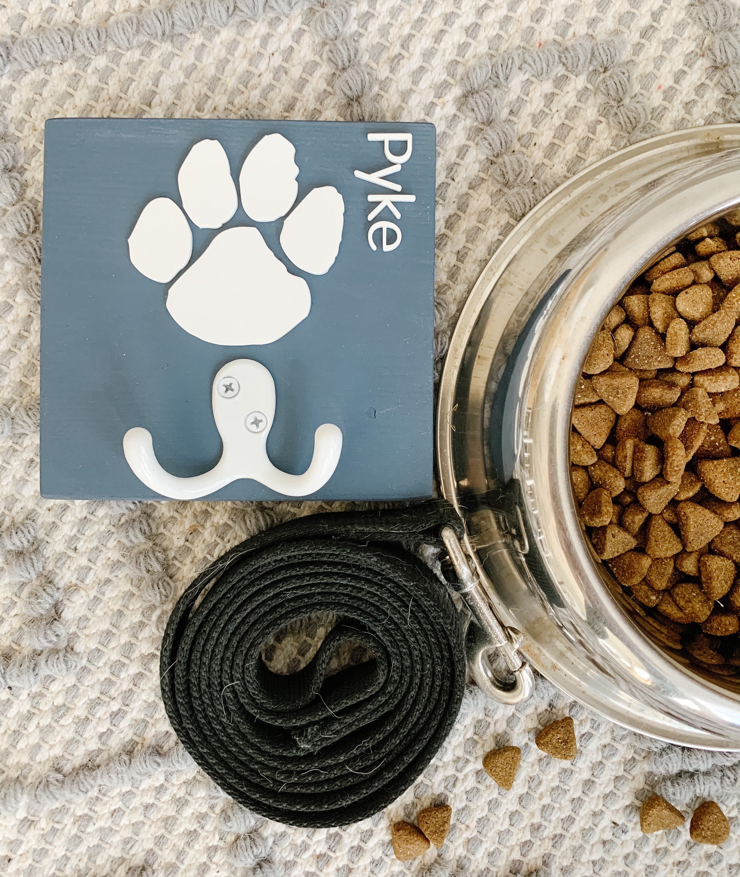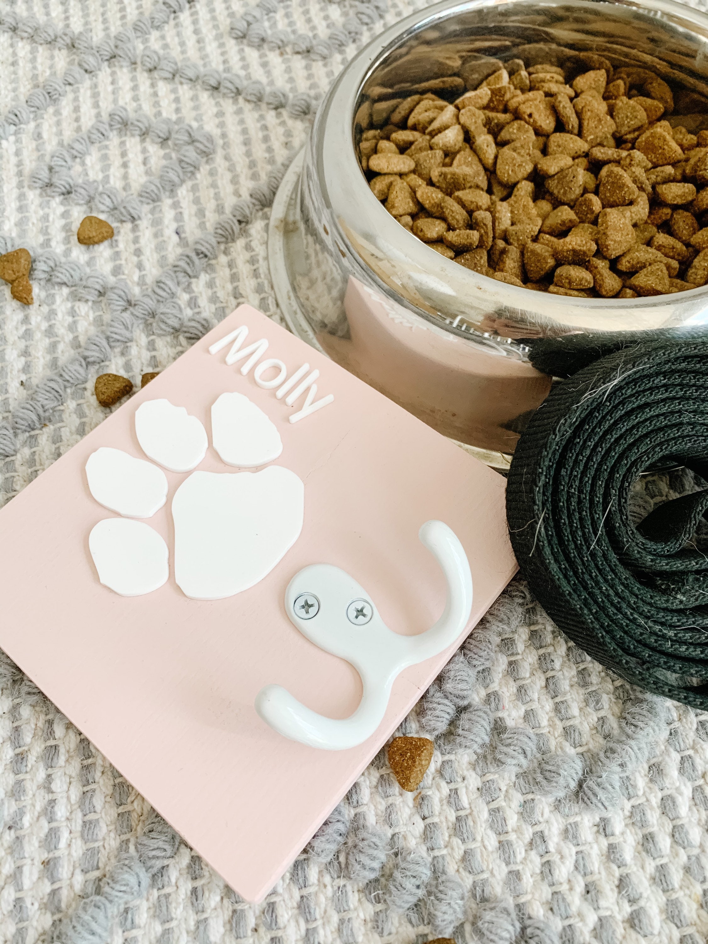 This dog leash/key holder is both an easy way to keep your leash in an easy to reach spot, as well as a way to proudly display your pet's name in your home! Makes a great pet parent gift!